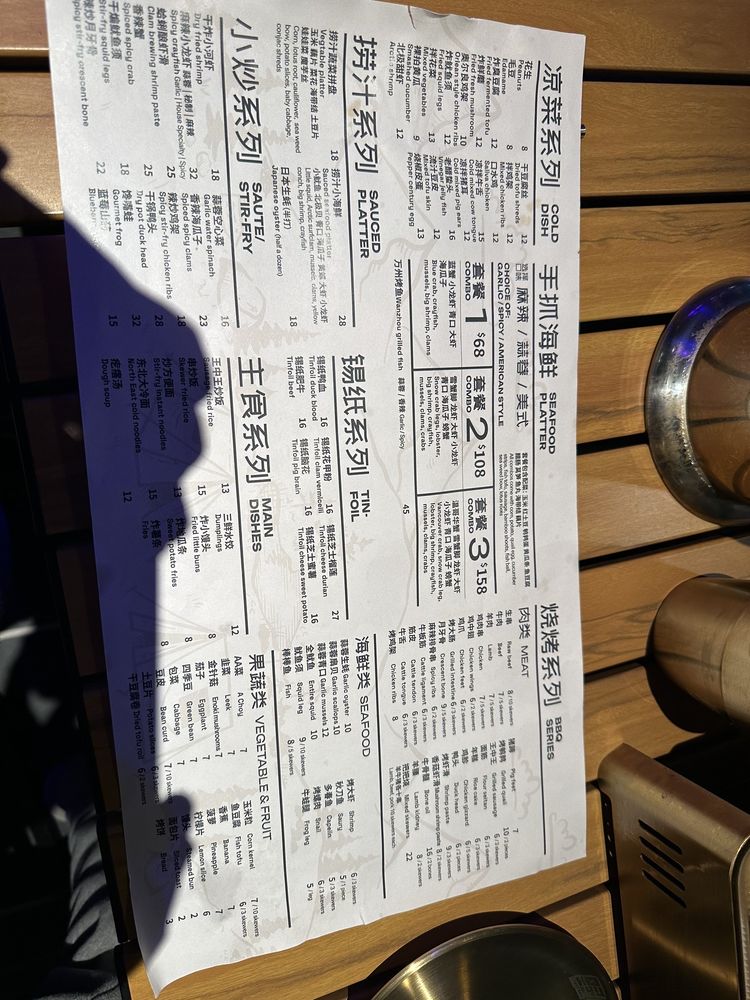 Blue Crab,Crayfish,Mussels,Big Shrimp,Clams. All Combos come with Corn,Potato,Quail Egg,Fish-tofu,Sausage,Fish Ball,Sea Weed Bow, Lotus Roots